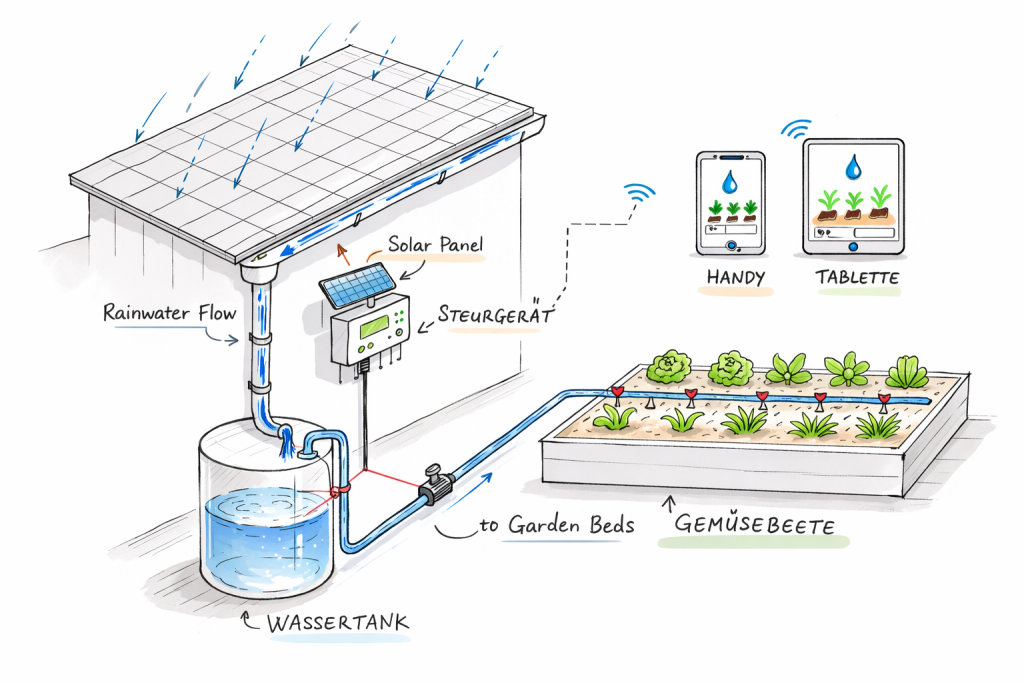 Unsere „Lösung für digitale Regenwassernutzung und Bewässerung“ umfasst: